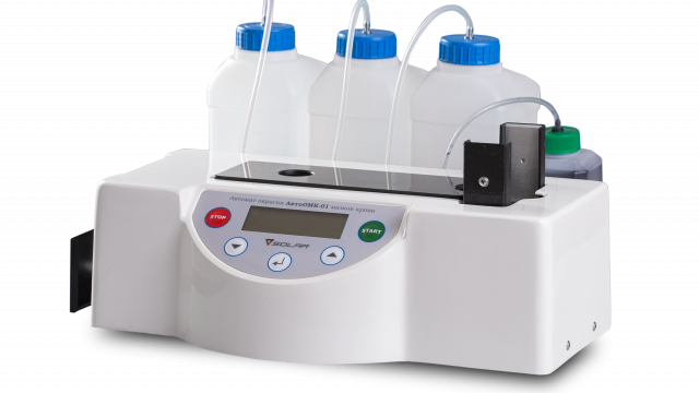 The automatic machine of coloring of blood swipes AutoOMK-01 is used in medicine and veterinary science. Labor-intensive process of manual coloring of blood swipes becomes convenient and highly productive