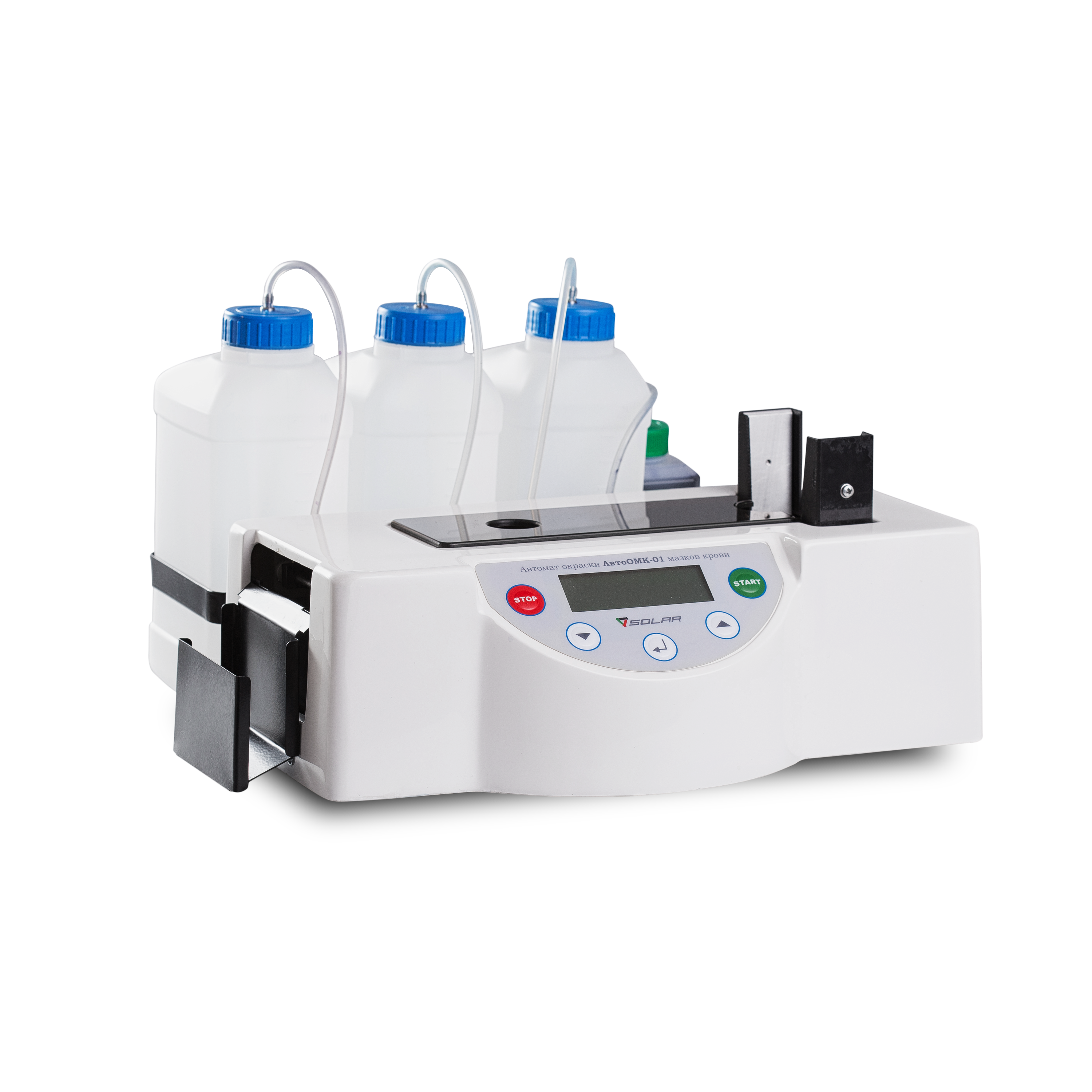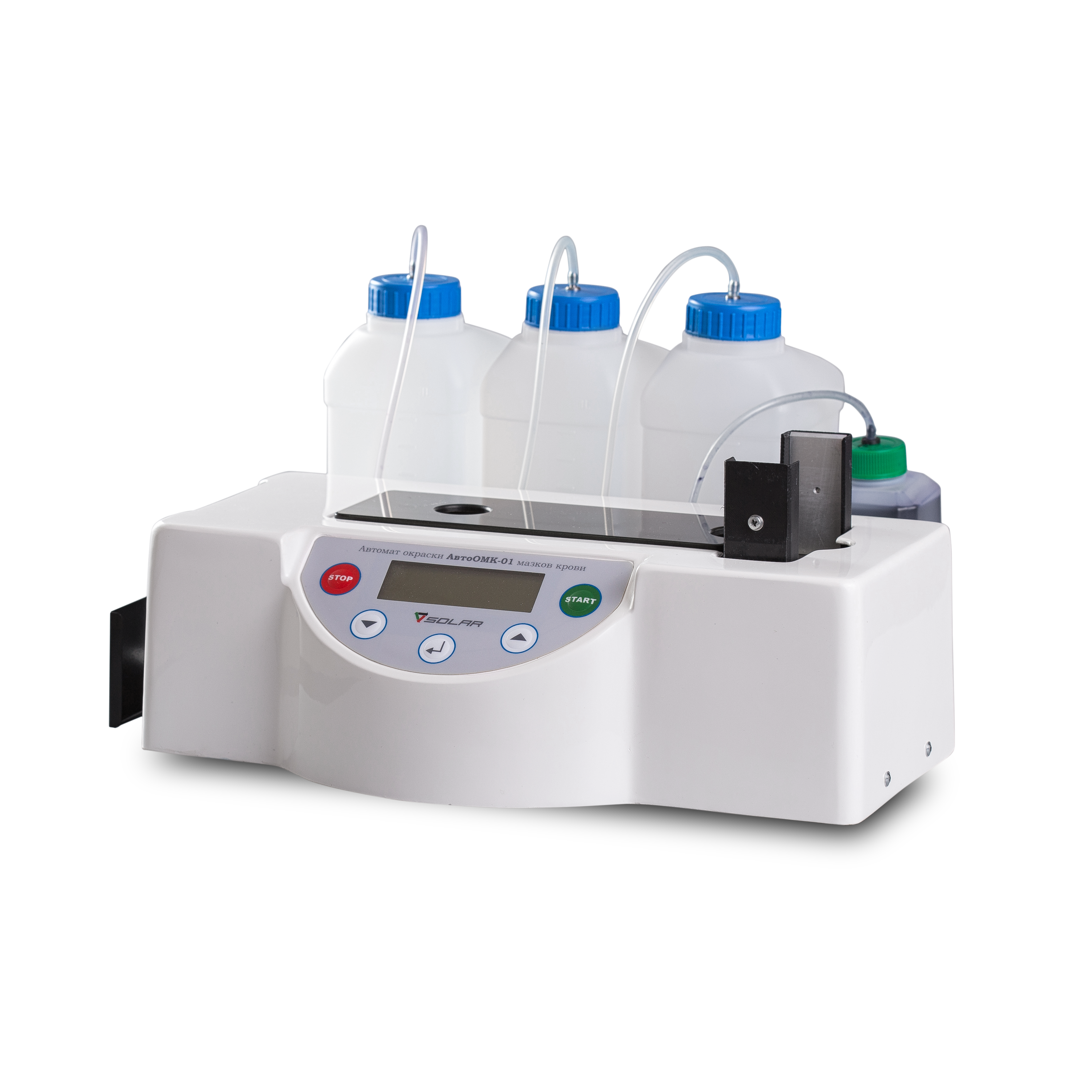 Автомат окраски мазков АвтоОМК-01 отслеживает количество окрашенных стекол и сигнализирует о необходимости замены реактивов Реактивы